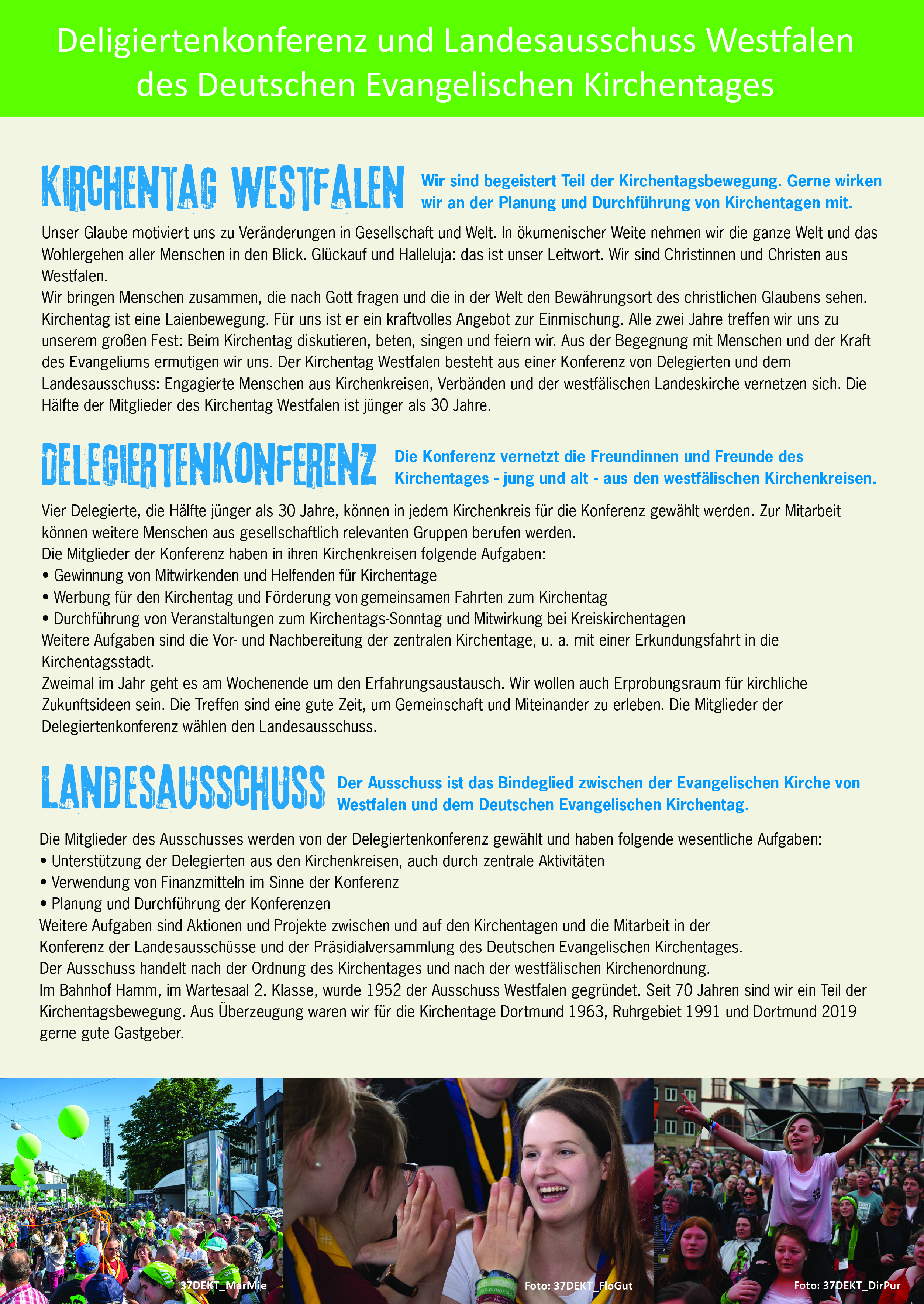 Der Landesausschuss mit seiner Delegiertenkonferenz vernetzt die Freundinnen und Freunde des Kirchentages-aus den westfälischen Kirchenkreisen, den kirchlichen Institutionen und der Zivilgesellschaft.