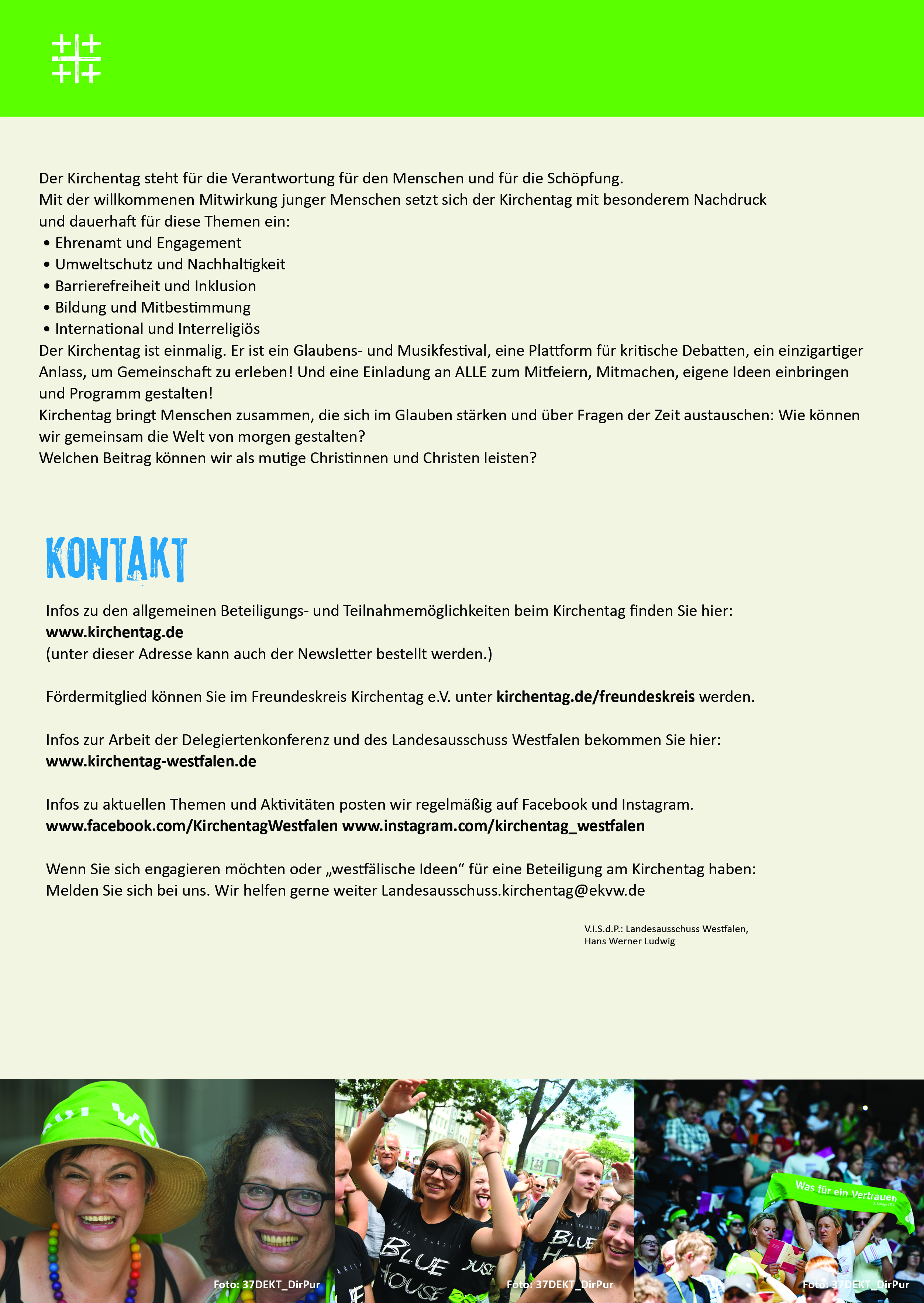 - Wenn Sie sich in Westfalen engagieren möchten oder „westfälische Ideen“ für eine Beteiligung am Kirchentag haben: Melden Sie sich bei uns. Wir helfen Ihnen gerne weiter.